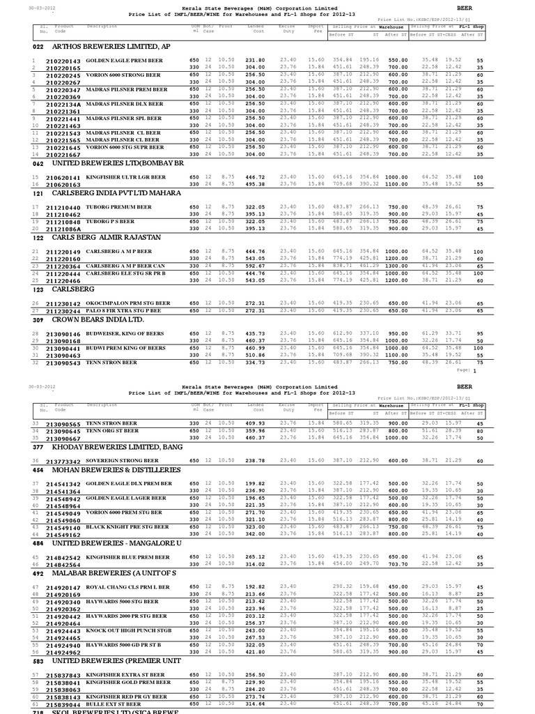All Kerala Kudeyans Association Price List Kerala State Bevarage