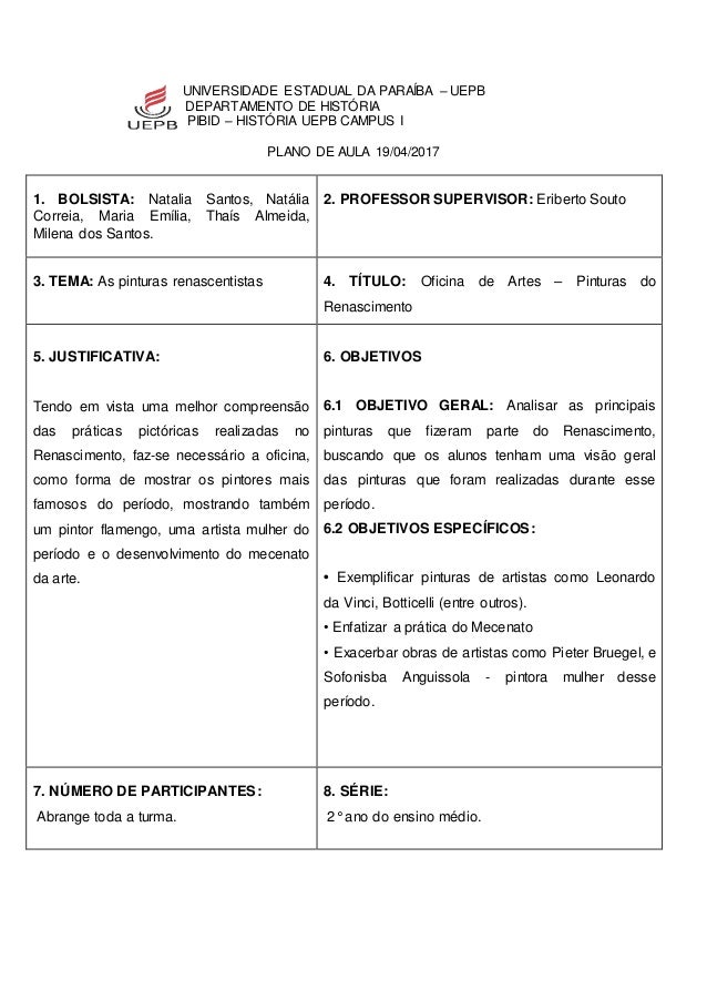 Plano De Aula Oficina De Artes As Pinturas Renascentistas